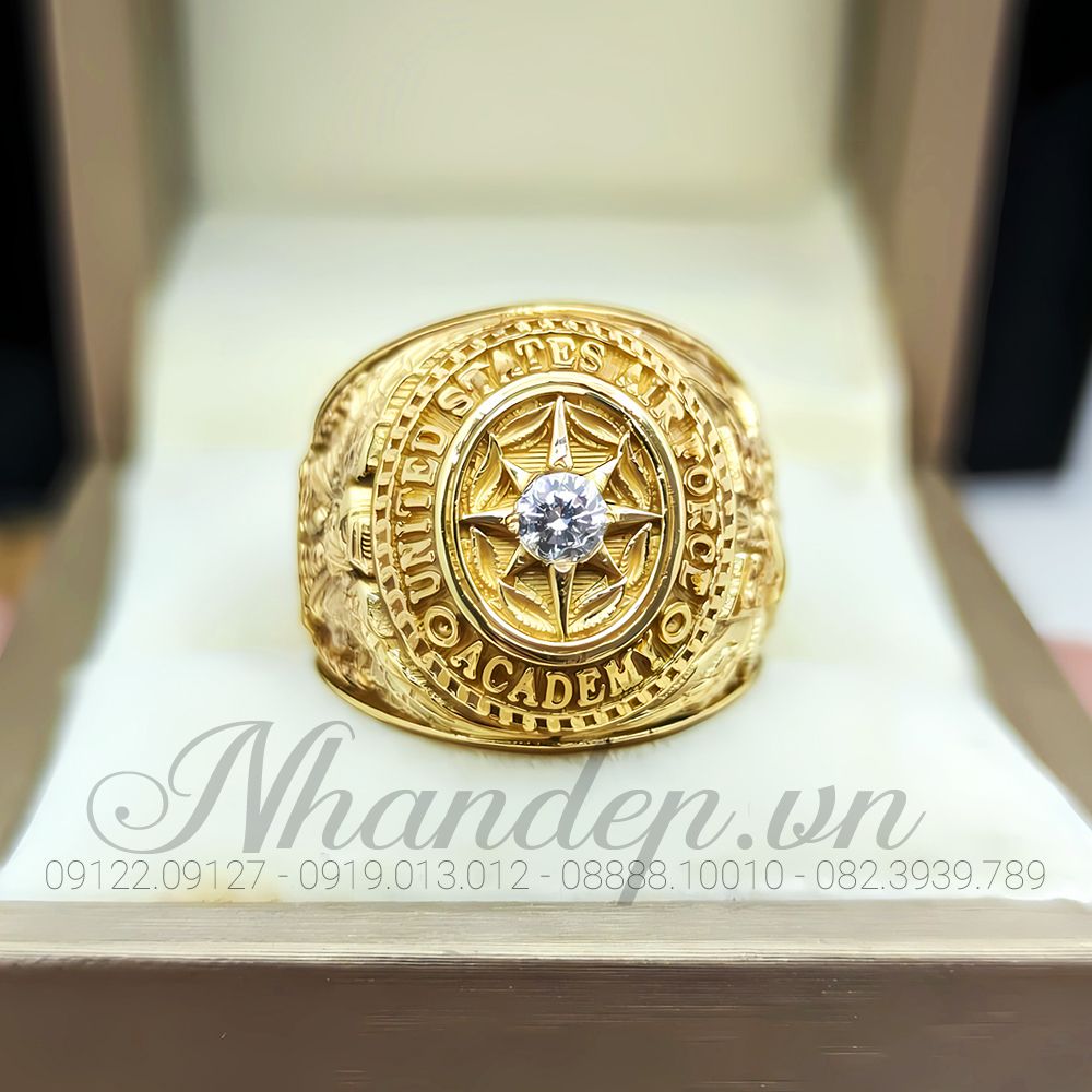 Chiếc nhẫn nổi bật với mặt đá sáng đặt trung tâm như ngôi sao dẫn đường, bao quanh bởi họa tiết huy hiệu Không Quân chạm khắc sâu, sắc nét. Thân nhẫn dày, form chuẩn, các mảng khối rõ ràng tạo cảm giác uy nghi – vững chắc – đẳng cấp nam tính. Tổng thể mang phong thái điềm tĩnh của người làm chủ có tư duy chiến lược và bản lĩnh, quyết đoán, khả năng nắm bắt cơ hội của người sở hữu.