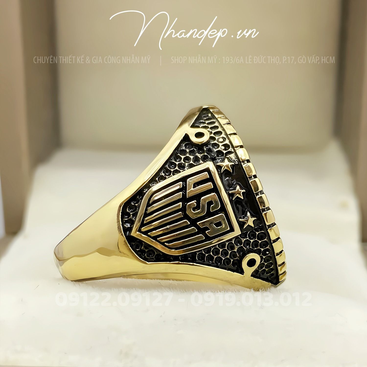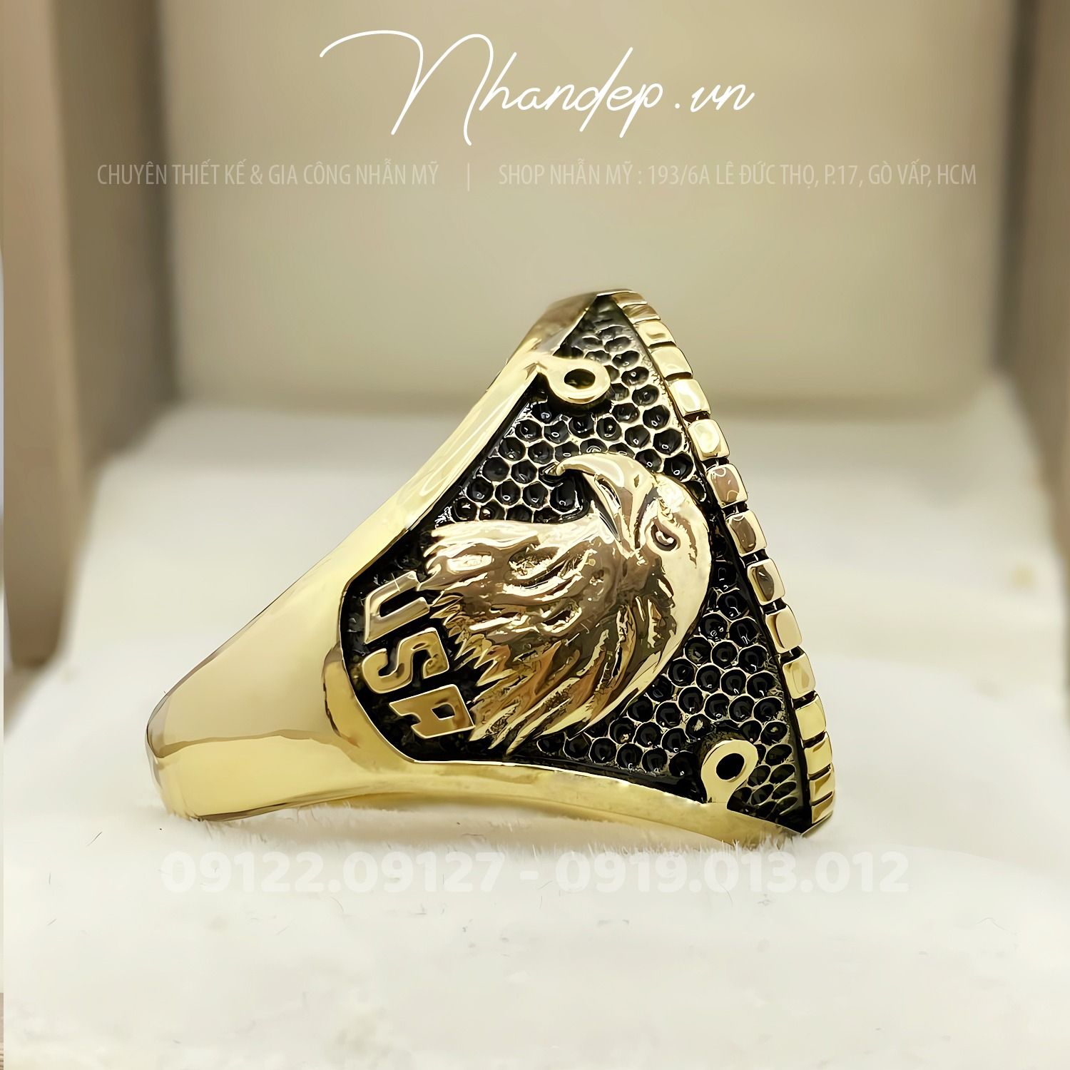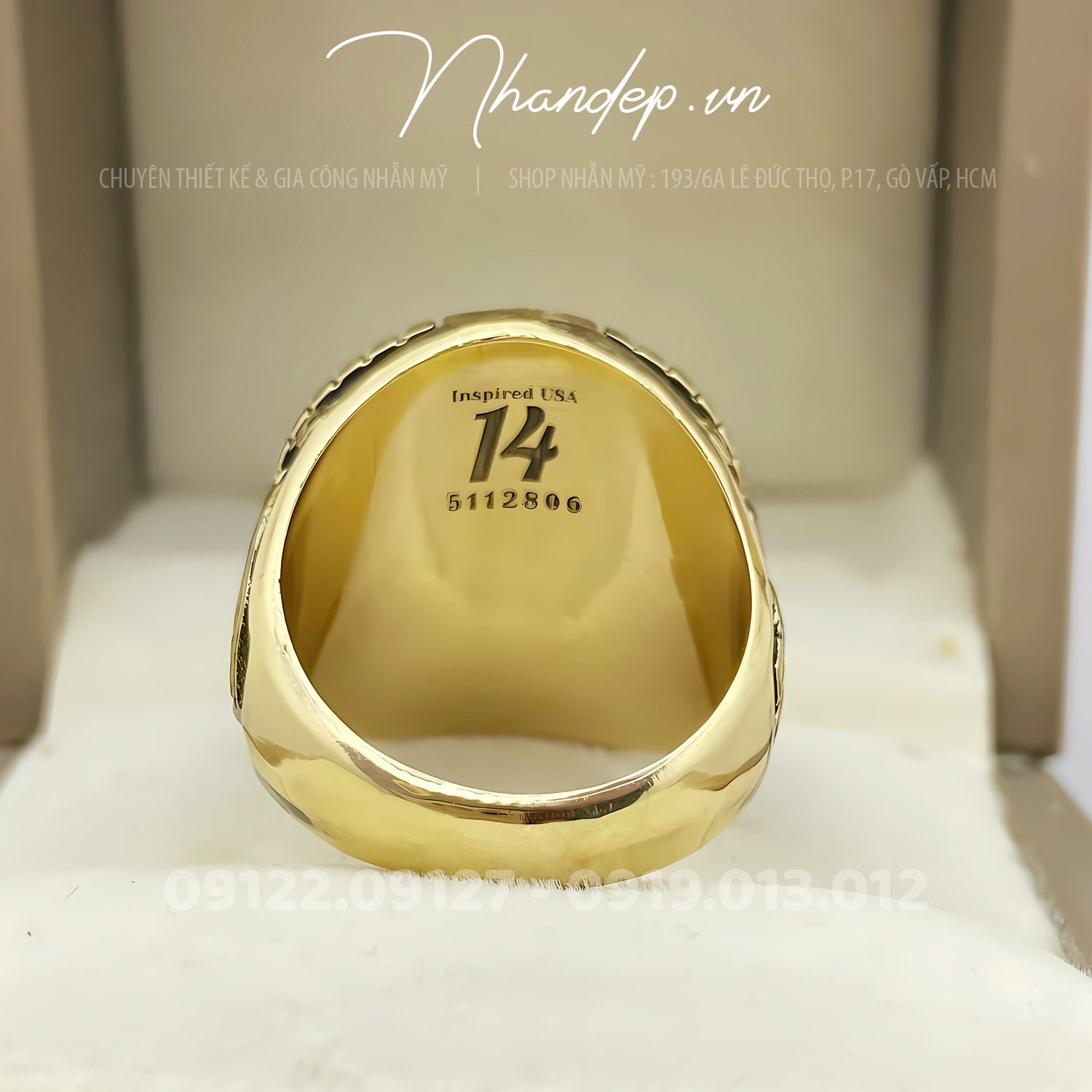 - Nhẫn được đúc từ hợp kim màu vàng độc quyền do shop tự phát triển. Không shop nào khác có, chuyên dùng để đúc nhẫn Mỹ. Cam kết nhẫn không bạc màu, sắc nét, nhìn như vàng thật, đúc được những mẫu nhẫn Mỹ cực khó.