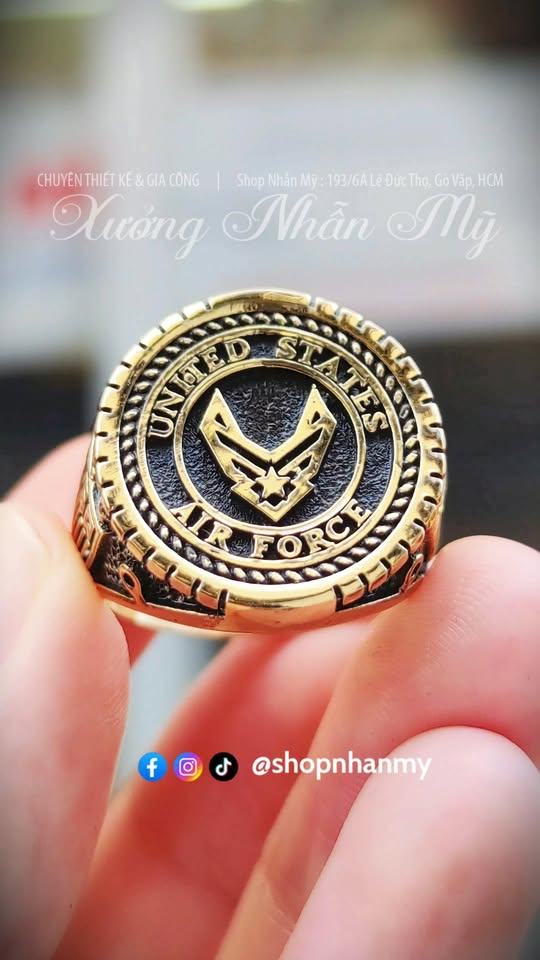 Nhẫn Không Quân Mỹ (US Air Force) – thiết kế tối giản, mặt tròn biểu tượng Không Quân sắc nét. Thân nhẫn khắc đại bàng mạnh mẽ, đúc nguyên khối chắc tay, hoàn thiện vàng bóng phối nền đen cổ điển. Phù hợp anh em thích phong cách quân đội gọn gàng, nam tính, dễ đeo hằng ngày.