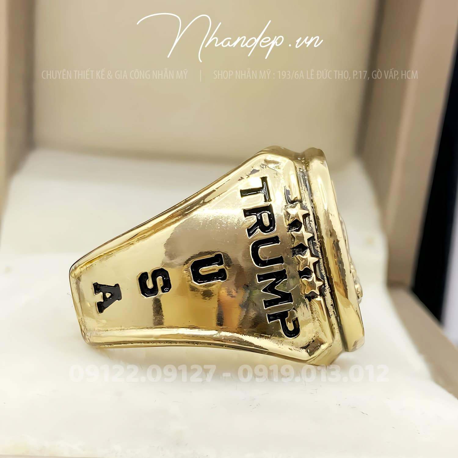 Mẫu nhẫn kỉ niệm khắc họa chân dung Tổng thống Mỹ Donald Trump với thiết kế nổi 3D sắc nét, tái hiện rõ thần thái quyết đoán – bản lĩnh – quyền lực của một nhà lãnh đạo gây ảnh hưởng toàn cầu. Bao quanh là dòng chữ “DONALD TRUMP – 45th PRESIDENT”, mang giá trị lịch sử và sưu tầm đặc biệt.