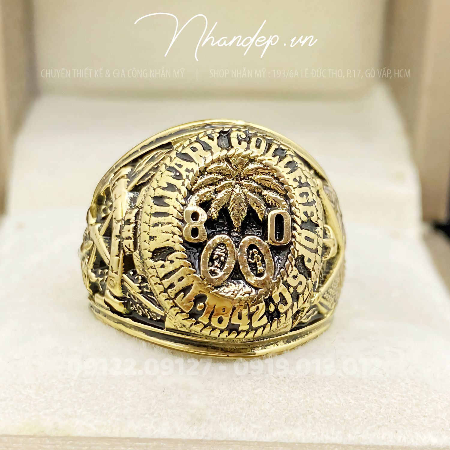 Mẫu nhẫn không hột đá mang đậm tinh thần trường quân đội Mỹ thập niên 1980, thiết kế dày dặn, form tròn cổ điển, đeo rất chắc tay. Trung tâm nhẫn nổi bật với huy hiệu – biểu tượng quân đội, chạm khắc sâu, sắc nét, thể hiện tinh thần kỷ luật – danh dự – bản lĩnh người lính.