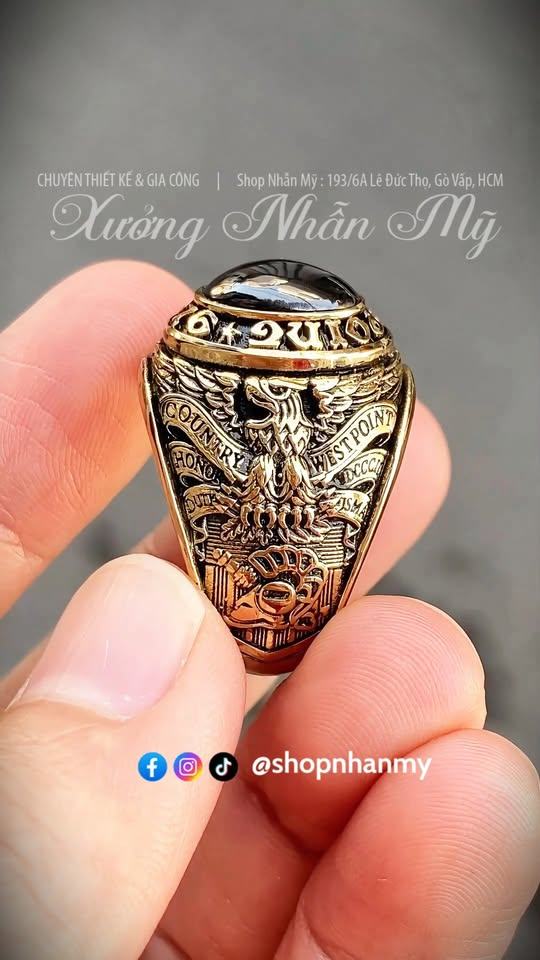 Nhẫn West Point (Học Viện Quân Sự Mỹ) 1968 Đá Mắt Mèo Cực Phẩm, Form Nổi 3D, Khảm Mực Đen Cổ Điển