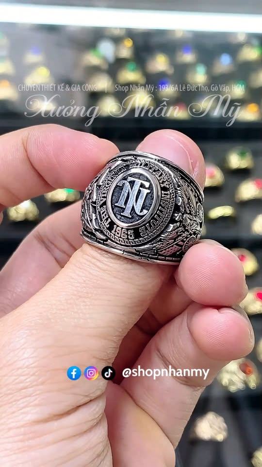 Nhẫn Hợp Kim Paladi Mẫu Custom Theo Yêu Cầu: Năm 1965, Mặt Chữ NT Lồng Vào Nhau, Khảm Mực Đen Cổ Điển